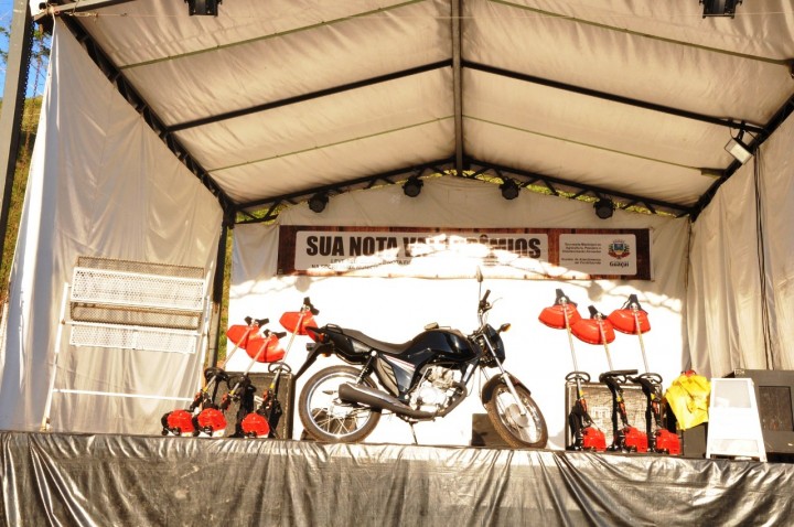 Foram sorteados uma moto e seis roçadeiras, da campanha “Sua nota vale prêmios”, dentro da programação da Expo Santa Luzia. (Divulgação Semag)