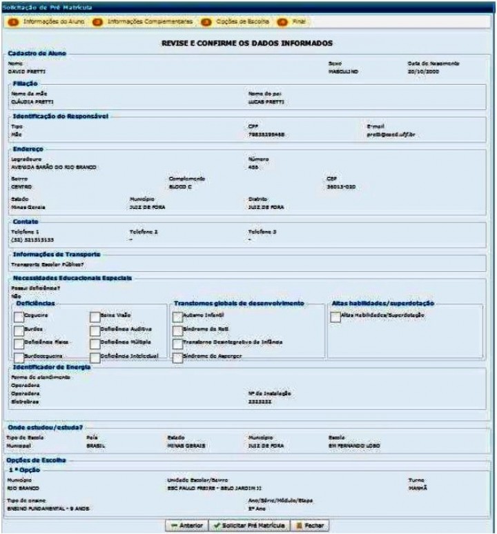 A pessoa deve clicar em OK para iniciar o preenchimento dos campos apresentados de 1 a 6. Na última aba do formulário de inscrição, então, será apresentado um resumo das informações preenchidas que devem ser conferidas, para ver se estão corretas e, depois, após confirmar, basta clicar em “Solicitar Pré-Matrícula”.