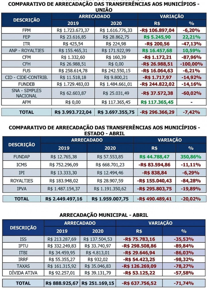 Tabelas de arrecadação mostram a queda da receita do município de Guaçuí, no mês de abril. Em 2019, somando as receitas provenientes da União, do estado e do município, o total é de R$ 7.332.144,87. Já em 2020, a mesma soma da arrecadação ficou em R$ 5.907.532,65. Ou seja, está aí a diferença de R$ 1.424.612,22. Uma queda de 19,43% (veja quadros abaixo com a discriminação das arrecadações).