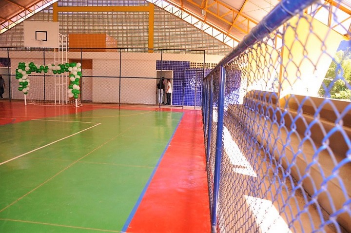 A quadra poliesportiva está equipada para várias modalidades, arquibancada, banheiros, depósito e cobertura metálica
