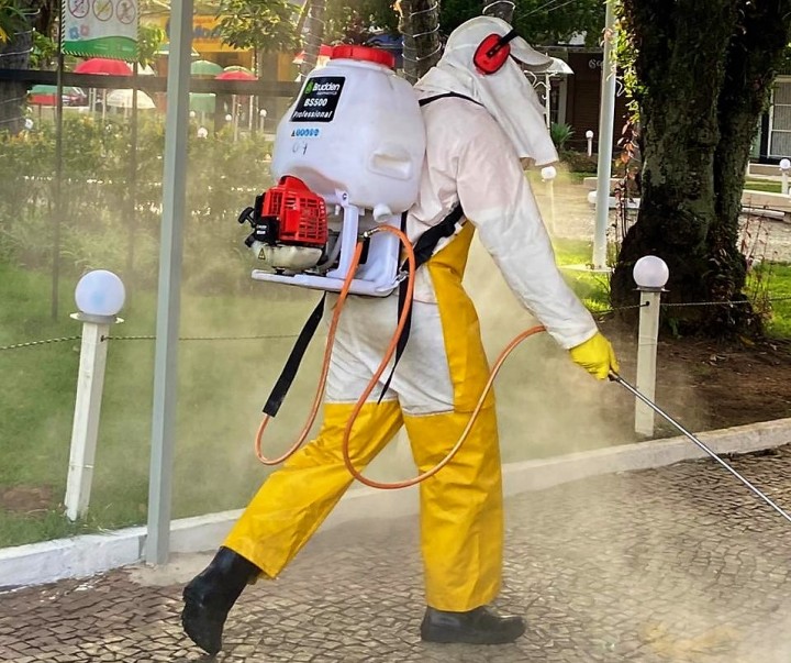Servidores da Vigilância em Saúde, da Semus, utilizam bombas costais eletrônicas, compradas pela Prefeitura, para a desinfecção de pontos onde acontece maior circulação e até aglomerações de pessoas. Todos utilizam equipamento de proteção individual (EPI) completo e borrifam uma solução de quaternário de amônia em pontos específicos da cidade. A aplicação da solução está sendo feita em locais como supermercados, agências bancárias, casas lotéricas, pontos de pagamento, agência dos Correios e grande parte do comércio.