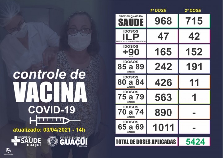 Neste sábado (3), a Secretaria Municipal de Saúde realizou ação de vacinação contra a Covid-19 para idosos com idade de 65 a 67 anos. A vacinação aconteceu de 8 às 12 horas, nos postos de saúde da Estratégia de Saúde da Família (ESF) na área urbana de Guaçuí, e na sala de vacinação do Centro de Convivência Alegria de Viver, localizado no antigo Parque de Exposições. Para agilizar a vacinação também houve aplicação de vacinas no formato Drive Thru. Em um só dia 703 pessoas foram imunizadas. Com isso, o município totaliza 5.424 vacinas aplicadas.