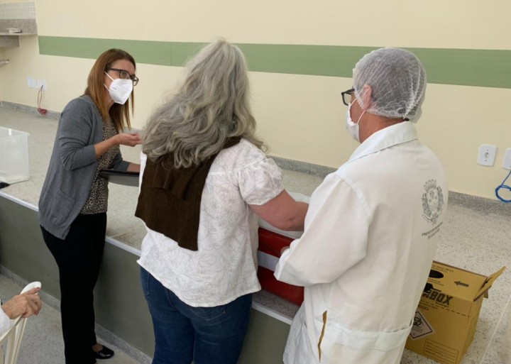 A coordenadora da imunização de Guaçuí, a enfermeira Mônica Falleiro Mendes, acompanhou a visita que teve como objetivo verificar o processo de imunização contra a COVID-19 no município, orientar a equipe responsável quanto aos protocolos do Ministério da Saúde relacionados ao transporte, armazenamento, acondicionamento dos imubiológicos e a logística nos agendamentos e definições dos grupos vacinados.