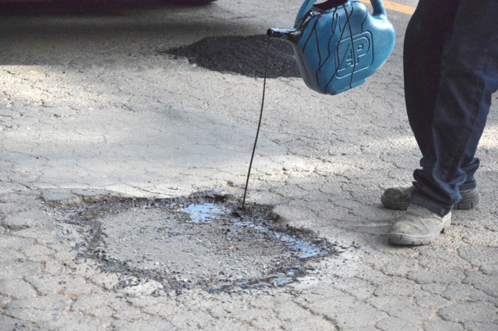 A equipe recortou em volta dos buracos, para nivelamento, em seguida, foi colocado pó de pedra e preenchido com asfalto quente. (Comunicação Guaçuí)