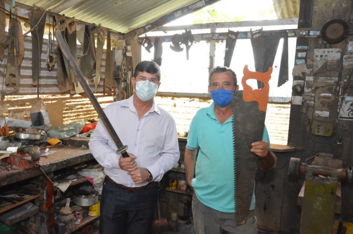 À convite do Sr. Antônio Carlos de Azevedo, de 63 anos, o prefeito Marcos Luiz Jauhar, o secretário de Cultura, Turismo e Esporte, Eleon Spala, e o superintendente de Cultura, Thiago Lobato, visitaram sua propriedade rural, para conhecer de perto como é sua rotina como artesão local. Sr Antônio superou suas limitações e aprendeu a produzir facas, canivetes, serrotes e até espadas.