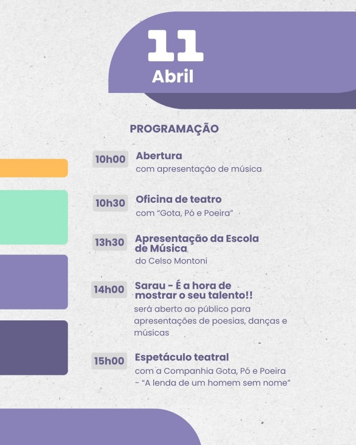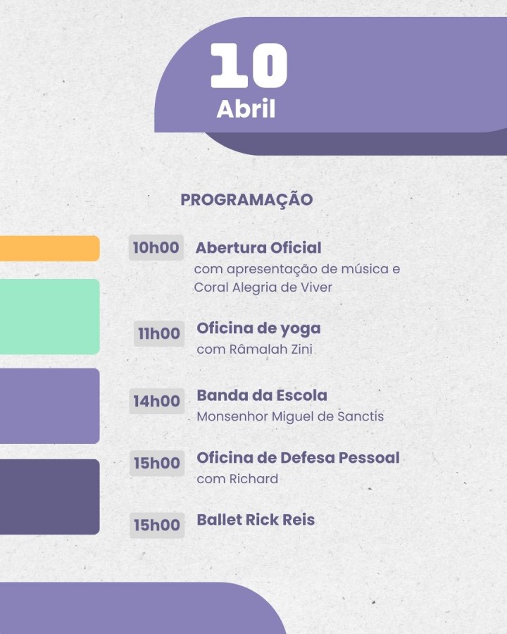 A Prefeitura Municipal, em parceria com o Fórum de Guaçuí, realizará nos dias 10 e 11 de abril, com início às 10 horas, o evento “Movimenta Guaçuí”. O objetivo do evento é promover ações sociais voltadas para diversas áreas, incluindo saúde, assistência social, orientação jurídica, além de serviços gratuitos como corte de cabelo. Durante os dois dias, serão oferecidas ainda palestras, apresentações de teatro e música, além de uma oficina de defesa pessoal.