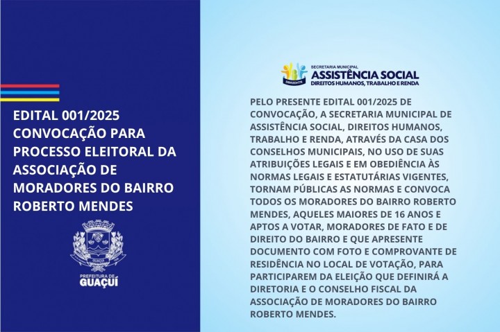 https://guacui.es.gov.br/noticia/2025/07/edital-001-2025-convocacao-para-processo-eleitoral-da-associacao-de-moradores-do-bairro-roberto-mendes.html