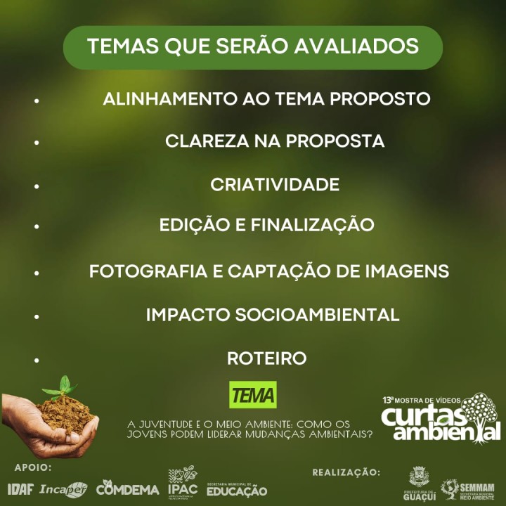 Os trabalhos inscritos serão avaliados em diversas modalidades: alinhamento ao tema proposto, clareza na proposta, criatividade, edição e finalização, fotografia e captação de imagens, impacto socioambiental e roteiro. Cada critério busca valorizar tanto a qualidade técnica das produções quanto a capacidade de transmitir mensagens relevantes e transformadoras.
