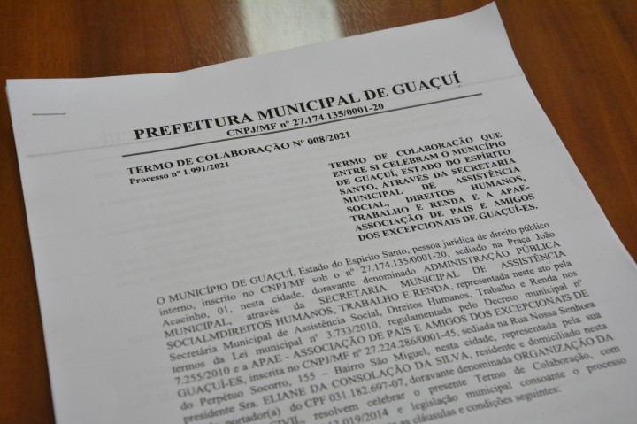 Na tarde desta terça-feira (04), o Prefeito Marcos Luiz Jauhar, a Secretária de Assistência Social, Direitos Humanos, Trabalho e Renda, Ivane Mendonça e a Presidente da Apae de Guaçuí, Eliane Amaral, assinaram o Termo de Colaboração no valor de R$ 240.003,00 com a APAE de Guaçuí, que visa a cooperação técnica e financeira para custear pagamento de funcionários e demais despesas necessárias para o desenvolvimento da instituição, visando à melhoria da qualidade de atendimento e a inclusão social de 70 (setenta) pessoas com deficiência intelectual e múltipla, transtorno global do desenvolvimento e seus familiares, durante o exercício de 2021.