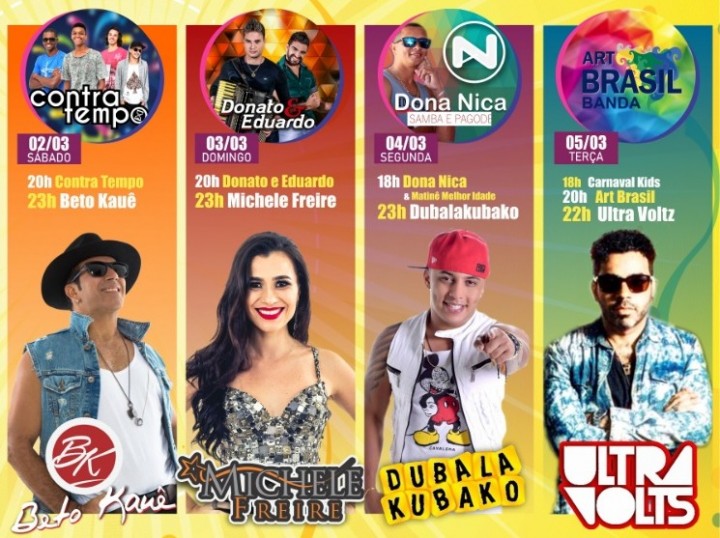 A programação vai começar no sábado de Carnaval (2/3), com os shows do grupo Contra Tempo e de Beto Kauê. No domingo (3/3), será a vez da dupla Donato & Eduardo e de Michele Freire. Na segunda-feira (4/3), a apresentações serão de Dona Nica Samba e Pagode e do grupo Dubalakubako. E no último dia (5/3) do GuaçuFolia, os shows serão da Banda Art Brasil e Ultra Voltz (veja programação completa abaixo).