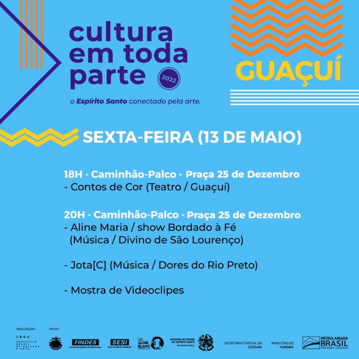 O Cultura em Toda Parte 2022 é uma idealização da Secretaria da Cultura do Espírito Santo e conta com a gestão e operacionalização do Instituto Brasil de Cultura e Arte – IBCA. Essa iniciativa também conta com apoio da Findes, do Sesi e da Prefeitura Municipal de Guaçuí.