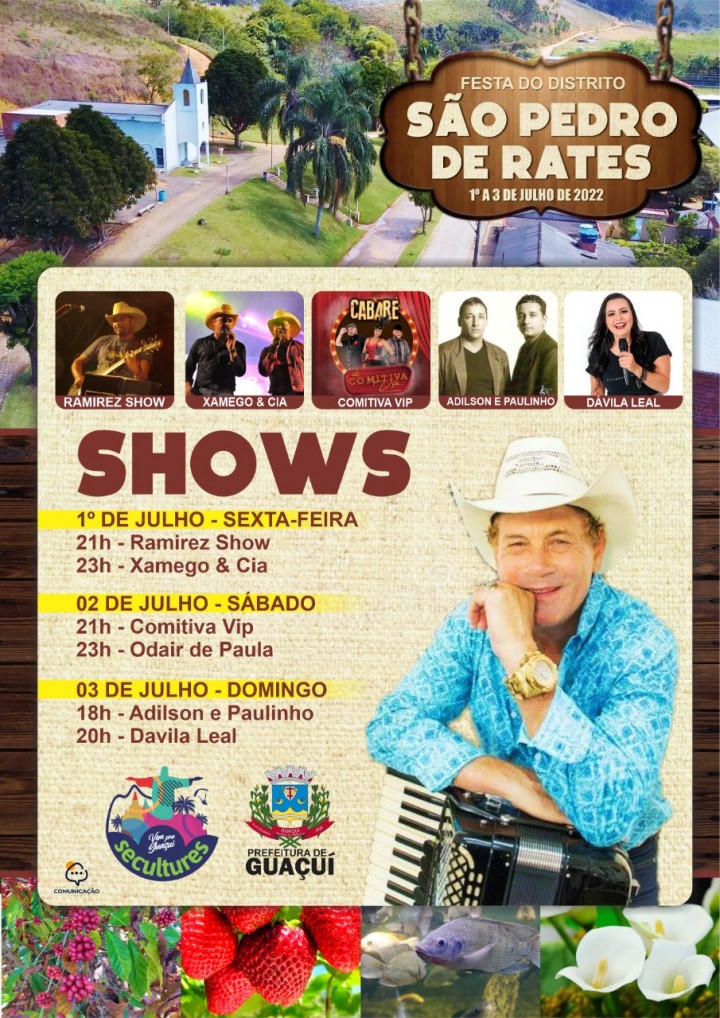 O distrito de São Pedro de Rates, em Guaçuí, estará em festa durante este final de semana. A partir da noite desta sexta-feira (01), será aberta a programação da festa que seguirá até a noite de domingo (03).