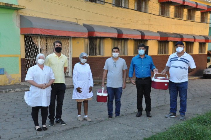 O prefeito Marcos Luiz Jauhar, o secretário de Saúde, Werton dos Santos Cardoso, e o vereador Julinho Tererê acompanharam a chegada da vacina ao lar dos idosos.