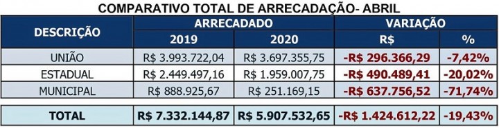 Comparando os meses de abril de 2019 e 2020, a queda na arrecadação foi de R$ 1.424.612,22, ou seja, 19,43%.(Comunicação Guaçuí)