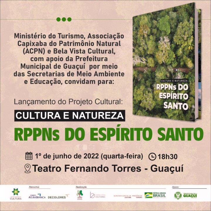 Guaçuí sediará o lançamento do livro “Cultura e Natureza, RPPNs do Espírito Santo” no Teatro Municipal Fernando Torres, no próximo dia 1º de junho às 18h30, dando início às comemorações alusivas ao mês do Dia Mundial do Meio Ambiente.
