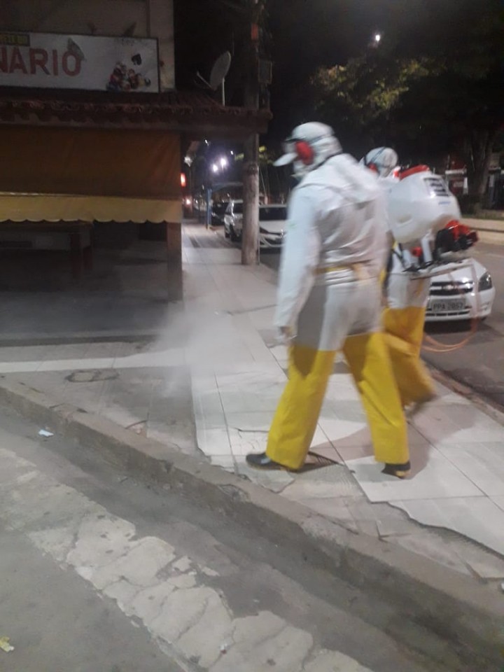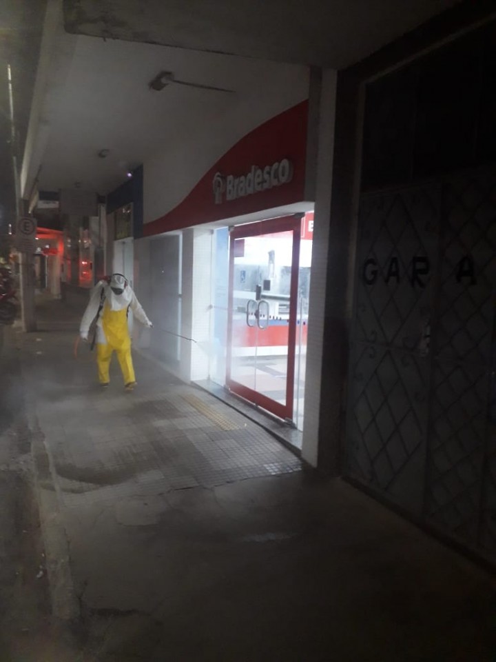 Todos os integrantes da equipe de higienização das ruas estão utilizando equipamento de proteção individual (EPI) completo e borrifando uma solução de quaternário de amônia em pontos específicos da cidade.