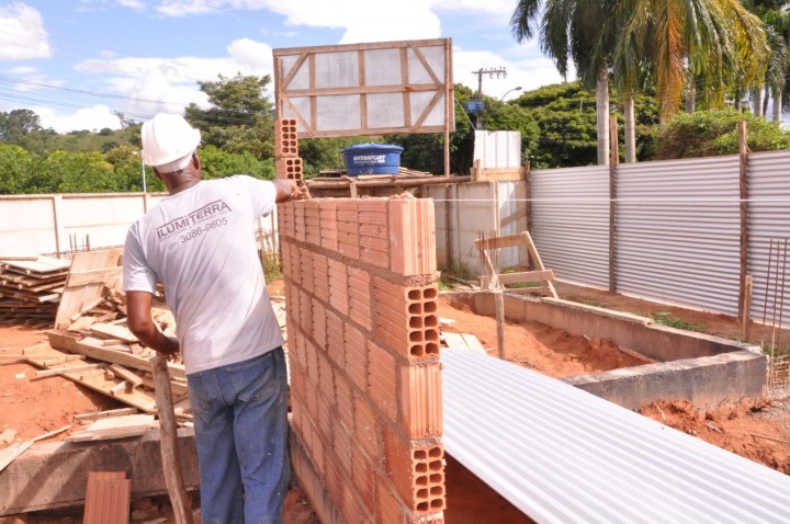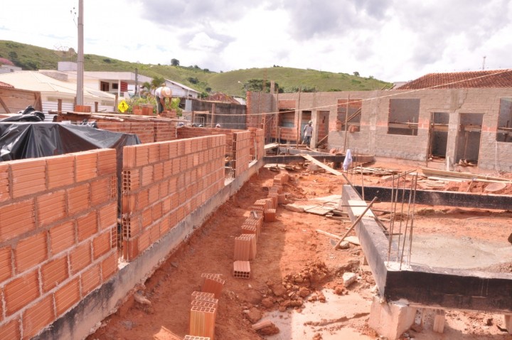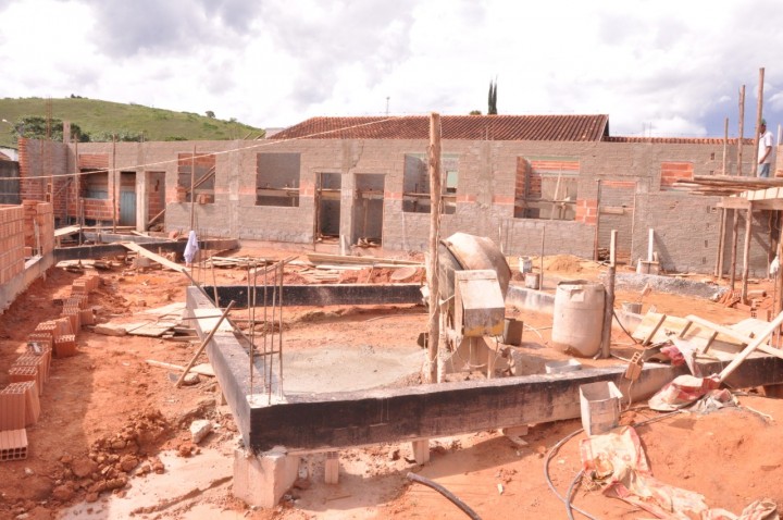 A obra da nova creche segue em ritmo acelerado, mas há muito ainda a ser feito, tendo sido concluída quase toda parte de infraestrutura, alvenaria e chapisco. (Divulgação PMG)