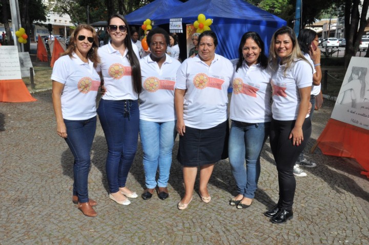 Na praça, estão estandes com material explicativo e orientações sobre o combate a esse crime que choca a sociedade.