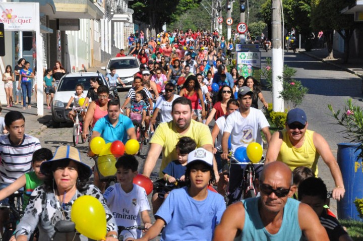 Os participantes do passeio ciclístico percorreram algumas ruas da cidade, terminando em frente ao Estádio Municipal Francisco Lacerda de Aguiar.