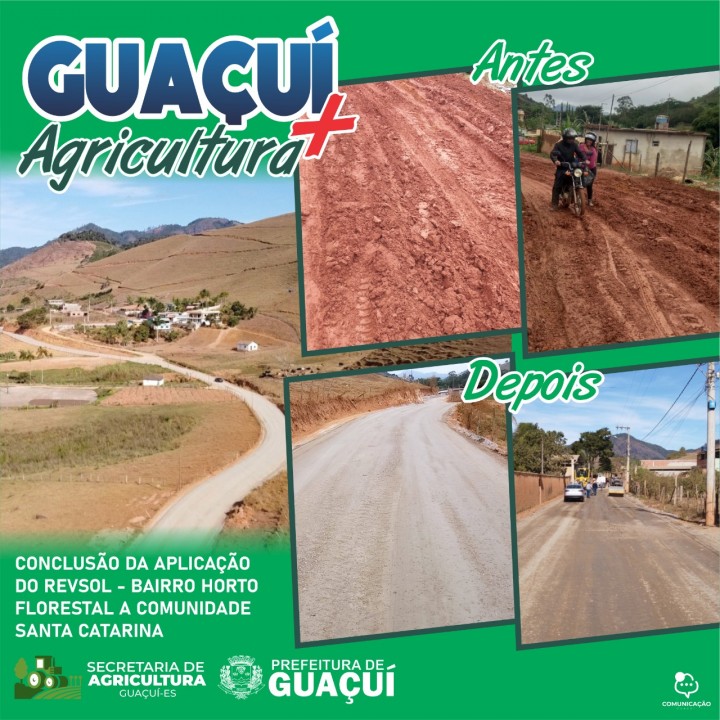 A Prefeitura Municipal de Guaçuí, por meio da Secretaria de Agricultura, concluiu as obras de aplicação de Revsol, em aproximadamente dois mil metros da estrada que liga o bairro Horto Florestal a comunidade Santa Catarina. O Revsol funciona como uma base para o revestimento primário do solo, evitando a erosão, o assoreamento, além de reduzir a formação de poças de lama em dias de chuva, o que dificulta a trafegabilidade no interior.