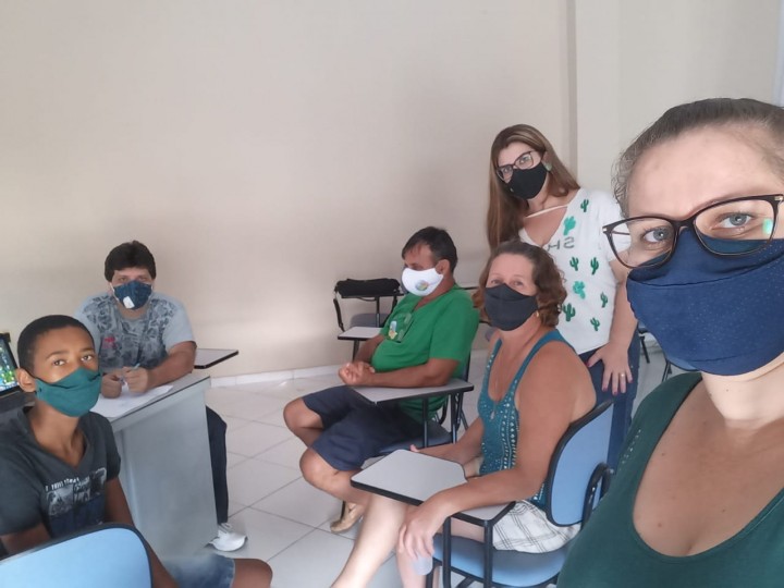 Participaram da reunião a secretária de agricultura, Christiany Fitaroni, a técnica da secretaria, Kênia Rezende, os representantes da Feira, Gerson, Elaine e Alex, e o programador, Sidinei Rangel.