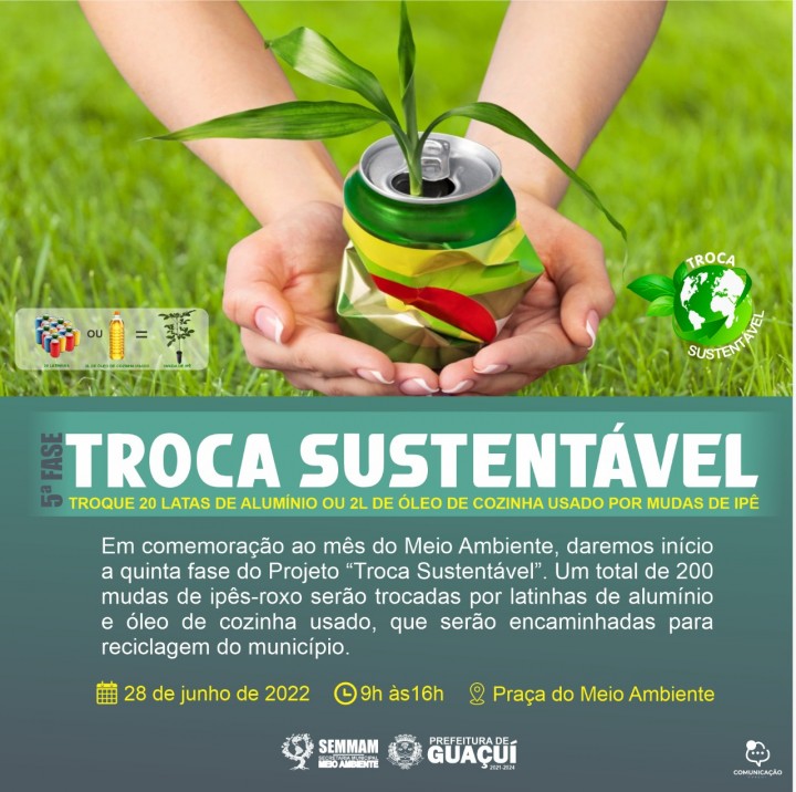 Em comemoração à programação alusiva ao mês do Meio Ambiente, a secretaria municipal de Meio Ambiente (Semmam), dará início a quinta fase do Projeto “Troca Sustentável”. Um total de 200 mudas de ipê-roxo serão trocadas por latinhas de alumínio e óleo de cozinha usado, que serão encaminhadas para reciclagem do município.