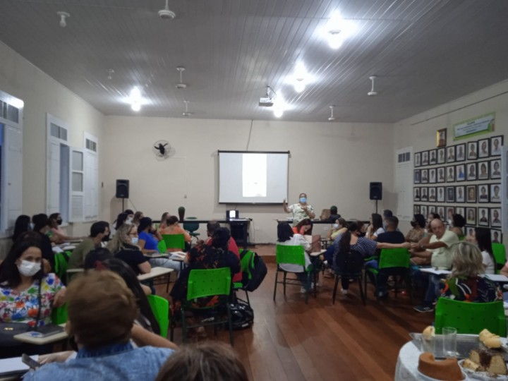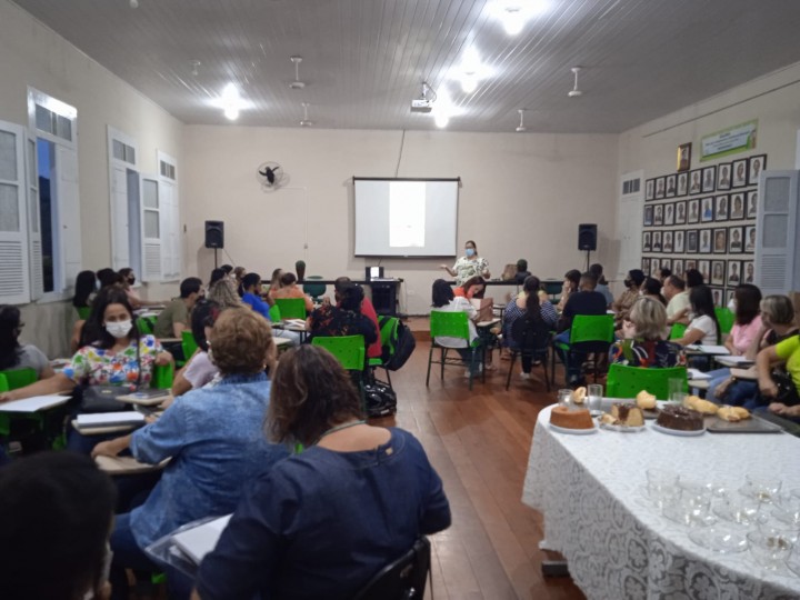 A reunião foi conduzida pela secretária de Educação, Sayonara Gil e pela superintendente de Educação, Enildes, para falarem sobre os resultados escolares do ano de 2021 e orientarem os presentes sobre o plano de ação para o ano de 2022.
